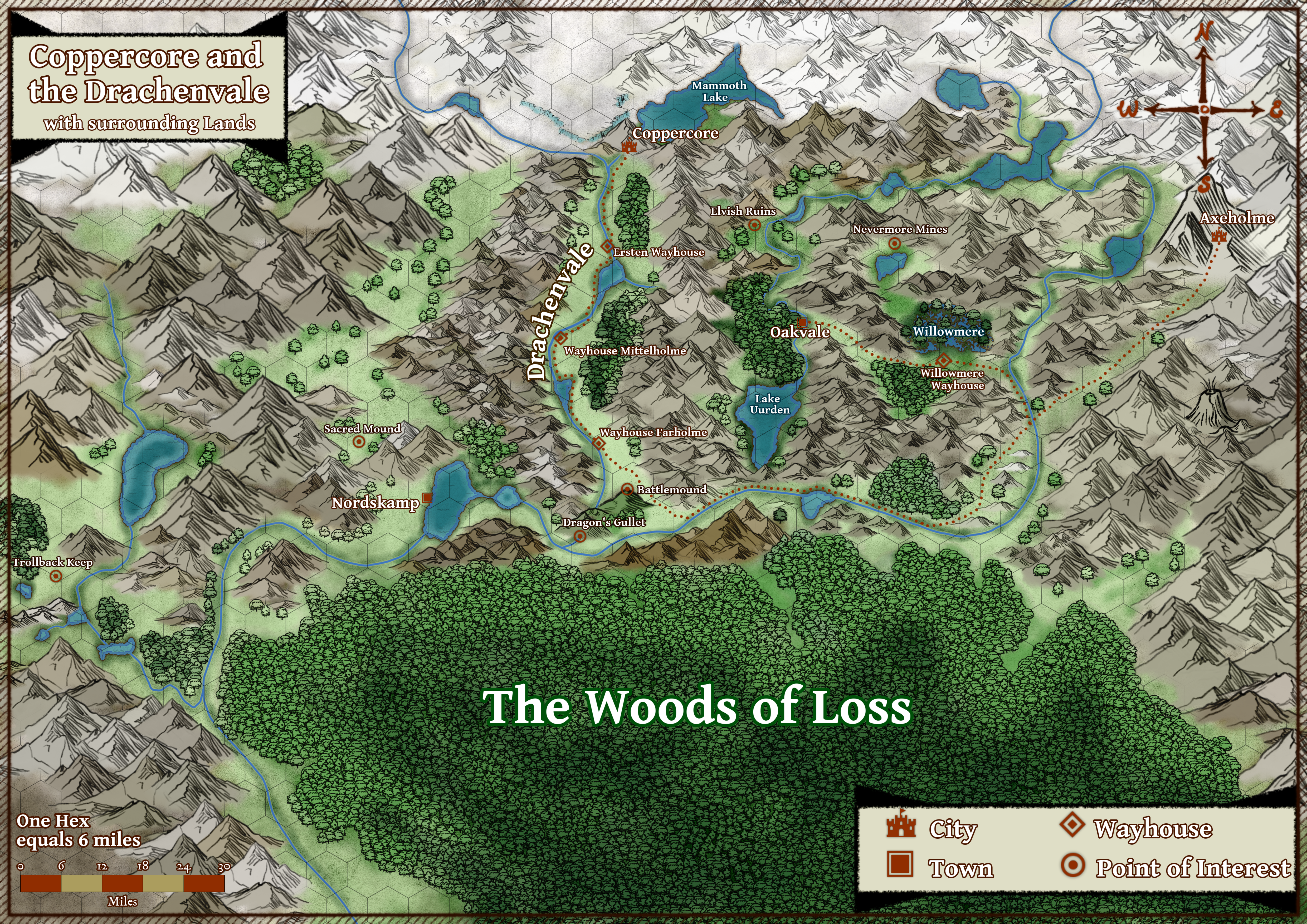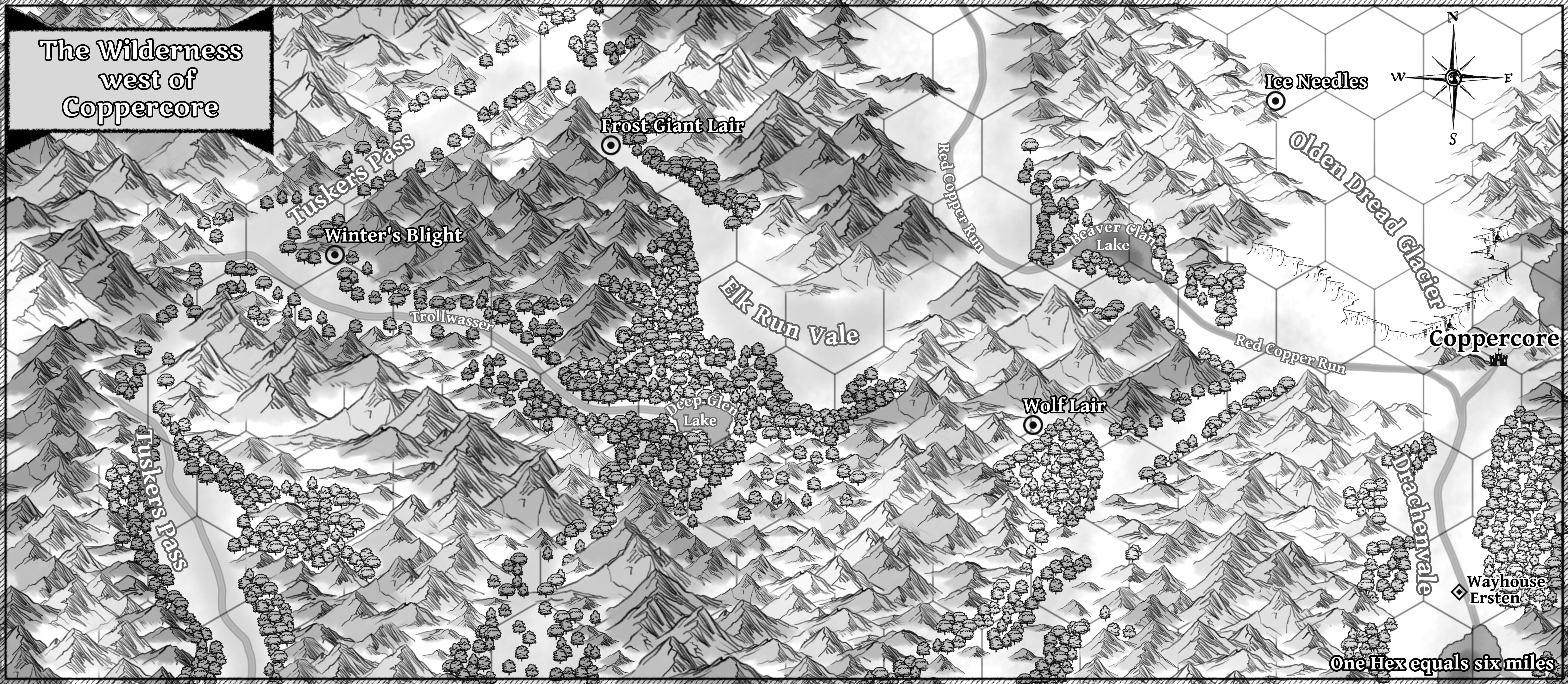 - 9 mini-adventures for wilderness and short dungeons across the Dragonback Mountains