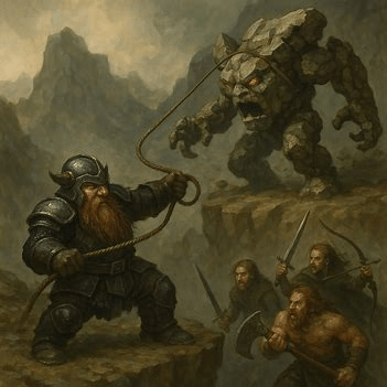 My name is Khazrik Cinderbrand, proud member of the Blackfume Brotherhood in the great mountain hold of Axeholme. Aye, that’s right, I’m a Great Mountain Dwarf and proud of it. Blackfume Brotherhood you ask? Well, most of it is a secret, and we are its guardians–the black blood of the mountains, the power of coal. But I’m bound to the Oath of the Black Breath, so shall not share more (although, all will be shared in our upcoming Dwarves of the Dragonback Mountain book). Nevertheless, this is me! Ya, I carry a lasso…my pops was a renowned rope user–don’t worry about it!