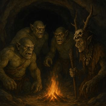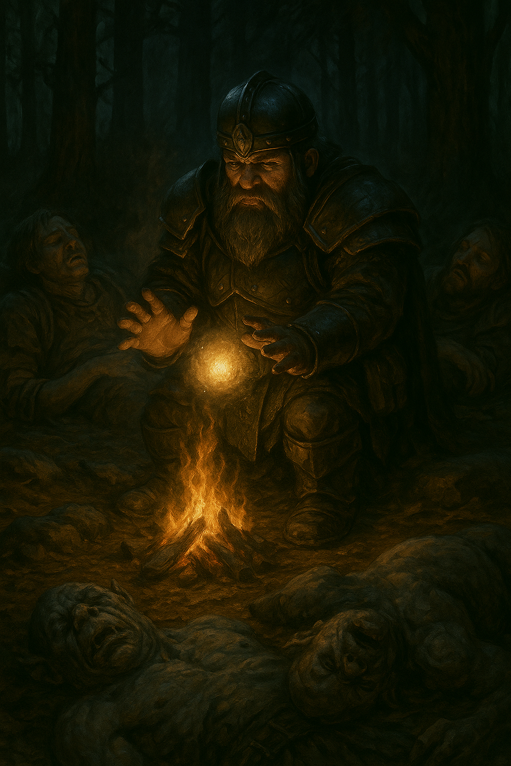 I groan, roll to my feet and gather my items and senses…then wander towards the fire. I grit my teeth and deal with my pounding headache and I start to heal myself as well as my companions, while trying to get a feel for this new stranger. Thank Dhurn Kavok…the Black Blood of the Mountain!! such miracles being able to heal wounds of my companions. Truly Dhurn should be the leader of the gods and I….ok, I could talk about Him for awhile, but Ill try to stick to the summary…ok?