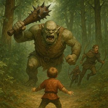 Suddenly, a figure was noticed on the edge of the forest by my more perceptive companions. We hailed him, and it was a young lad by the name of Talon. I offered him drink and food and we shared news while we broke bread. We told him our story and he seemed interested in helping us! Seemingly having found a new companion, we decided to go back to the ogre cave.