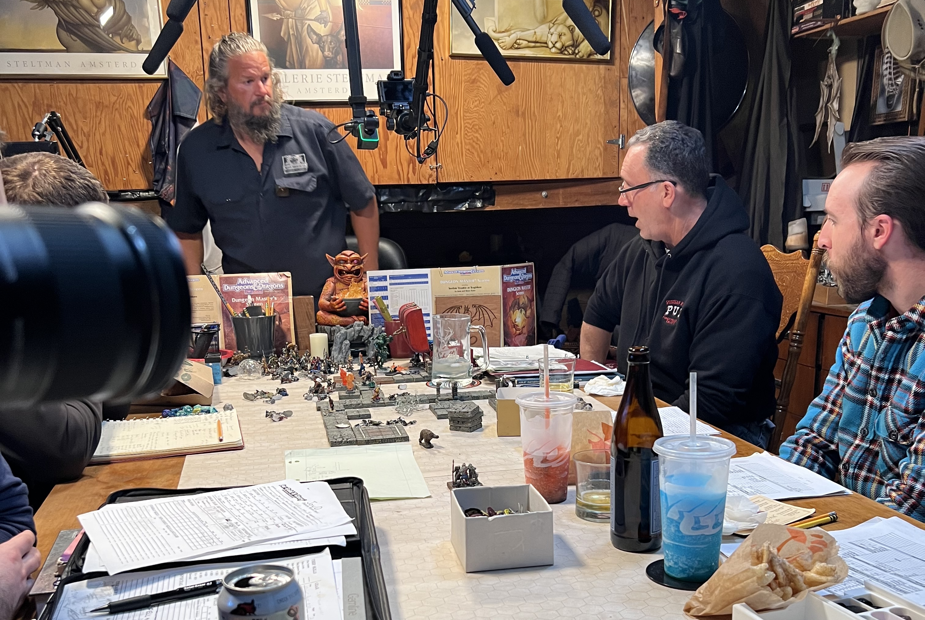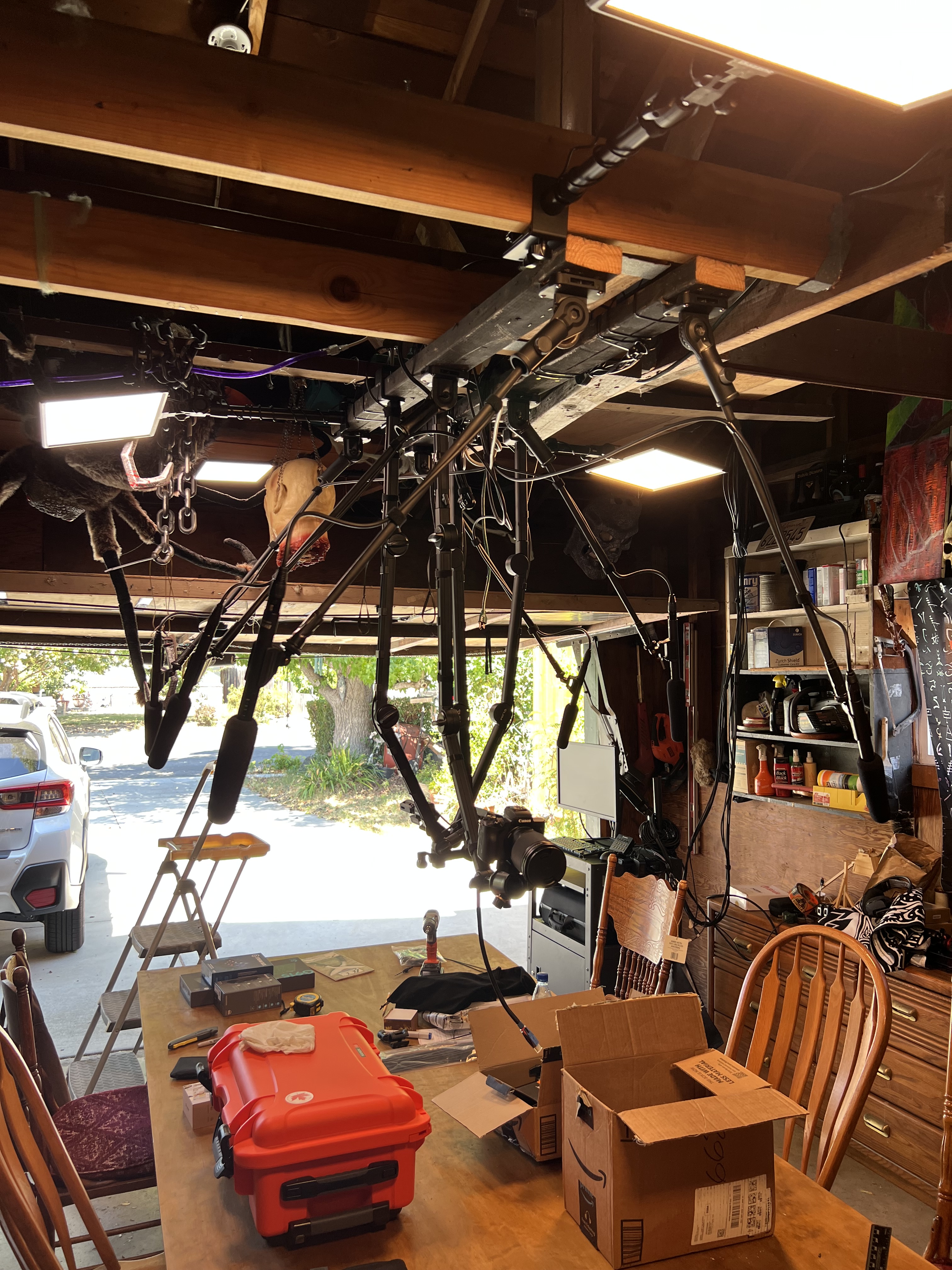 A lot of work has been done by The Director to prep a meager “garage” into the “Live Studio Streaming Dungeon Set”. From multiple lights, shotgun mics connected to a twelve-channel mixer, cables… so many damn cables… and three iterations of best placements.